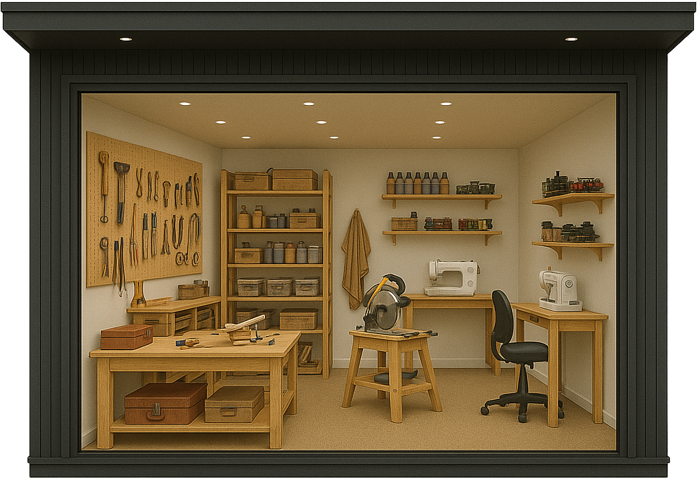 Whether you’re a passionate crafter, DIY enthusiast, or model railway builder, a garden room can be the perfect workshop. Custom storage, durable worktops, and power outlets make it easy to keep your tools organised and your projects on track.